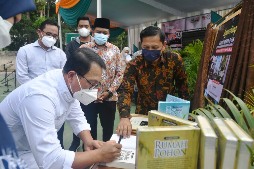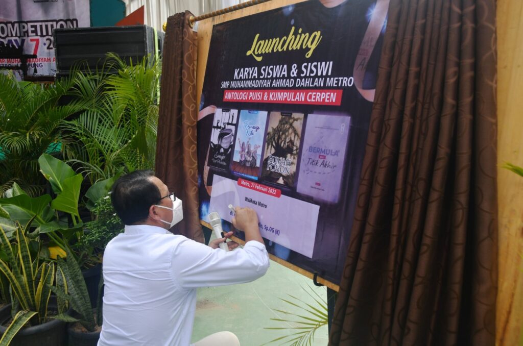 Selepas membuka kegiatan Competition Day VII, Wahdi Siradjuddin, ikut menandatangani karya siswi dan guru berupa buku siswi dan guru tentang Antologi puisi, dan kumpulan cerpen. (Ins/AgR)
