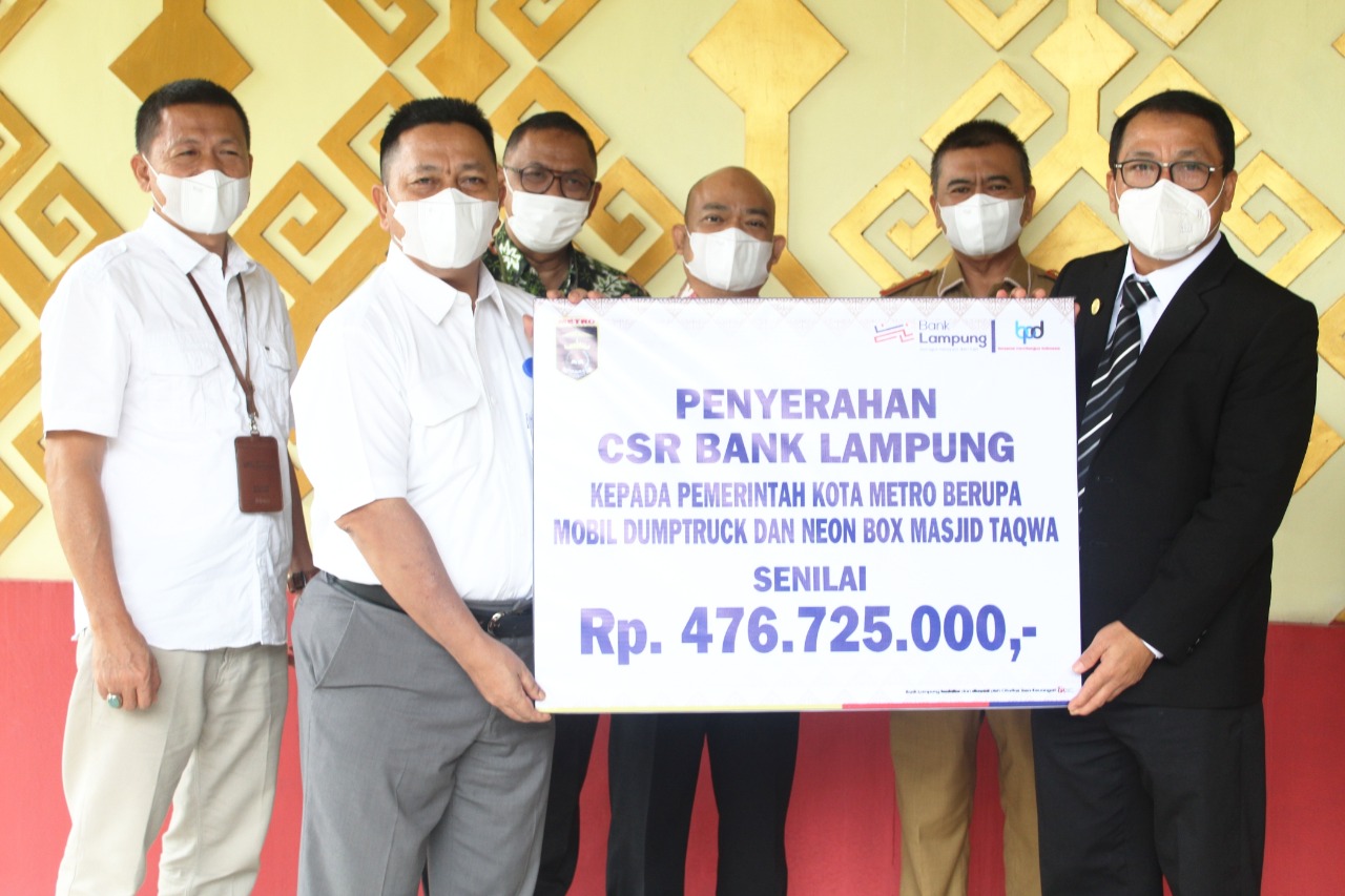 Pemerintah Kota Metro menerima bantuan Coorporate Social Responsibility (CSR) dari PT. Bank Lampung di halaman Rumah Dinas Walikota Kota Metro, Senin (18/10/2021). Dalam hal ini, Walikota Metro Wahdi secara langsung menerima CSR yang diberikan yaitu berupa 1 mobil Dump Truck dan Neon Box Masjid Taqwa senilai 476.725.000 rupiah. Dirut PT. Bank Lampung Presley Hutabarat menyampaikan, semoga CSR ini bermanfaat dan sebelumnya Bank Lampung juga memberikan bantuan berupa sembako. Walikota Metro Wahdi mengucapkan terima kasih kepada Bank Lampung atas CSR yang diberikan. “Mudah-mudahan Bank Lampung selalu bisa memberikan kontribusi kepada Kota Metro,” tuturnya. (tm/cv)
