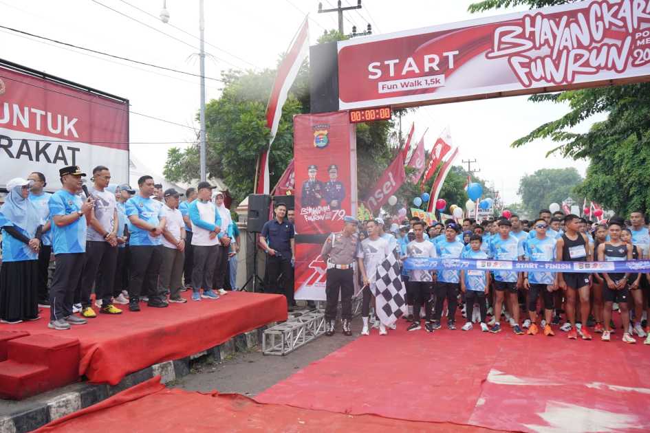 Berkolaborasi dengan Pemerintah Kota Metro dan pihak swasta, Polres Metro sukses menyelenggarakan Bhayangkara Fun Run 2025 dalam rangka memperingati Hari Bhayangkara ke-79, pada Minggu (29/6) pagi di halaman Markas Komando Polres Metro. Start dan finish di depan Polres Metro, acara ini menghadirkan dua kategori kegiatan, yakni Fun Run sejauh 5 kilometer dan Fun Walk sejauh 1,5 kilometer, yang diikuti oleh ribuan peserta dari berbagai kalangan masyarakat. Kegiatan secara resmi dibuka oleh Wali Kota Metro, H. Bambang Iman Santoso, S.Sos., M.Pd.I, didampingi Wakil Wali Kota Metro, Dr. M. Rafiq Adi Pradana, serta dihadiri oleh Forkopimda dan jajaran Pemerintah Kota Metro. Wali Kota Metro juga turut berpartisipasi langsung dalam kategori Fun Walk 1,5K, berbaur bersama warga dengan penuh semangat kebersamaan. Dalam sambutannya, Wali Kota Metro menyampaikan bahwa Bhayangkara Fun Run merupakan momentum penting untuk mendorong gaya hidup sehat yang terintegrasi dalam kehidupan masyarakat. “Kegiatan Bhayangkara Fun Run ini adalah salah satu bentuk hidup sehat yang sangat relevan dengan situasi kesehatan masyarakat kita saat ini. Olahraga seperti lari dan jalan kaki tidak hanya mudah dilakukan oleh berbagai kalangan, tapi juga sangat efektif menjaga kesehatan jantung dan kebugaran tubuh,” ujar Bambang. Sementara itu, Kapolres Metro, AKBP Hangga Utama Darmawan, S.I.K., menyampaikan bahwa kegiatan ini tidak hanya menjadi ajang peringatan HUT Bhayangkara, tetapi juga sebagai sarana membangun kedekatan Polri dengan masyarakat. “Bhayangkara Fun Run 2025 ini kami hadirkan sebagai ruang kebersamaan antara Polri dan masyarakat. Kami ingin menunjukkan bahwa Polri senantiasa mendukung gaya hidup sehat dan positif. Melihat antusiasme warga yang luar biasa pagi ini adalah kebanggaan tersendiri bagi kami,” ungkap Kapolres. Kapolres Metro juga mengucapkan terima kasih kepada Pemerintah Kota Metro dan seluruh pihak yang telah mendukung terselenggaranya kegiatan ini. Ia berharap Bhayangkara Fun Run dapat menjadi agenda tahunan yang inspiratif dan dinantikan masyarakat. Pemerintah Kota Metro menyampaikan apresiasi atas sinergi yang kuat antara aparat kepolisian, masyarakat, dan pemangku kepentingan dalam mendukung suksesnya kegiatan ini. Semangat kebersamaan yang ditunjukkan dalam Bhayangkara Fun Run diharapkan dapat mempererat hubungan sosial serta mendorong pola hidup sehat di lingkungan Kota Metro. Dalam kegiatan ini, juga dihadiri Wakil Wali Kota Metro, Dr. M. Rafieq Adi Pradana, Forkopimda dan sejumlah kepala OPD serta ribuan masyarakat dan pecinta olahraga lari. (dns/ygy)