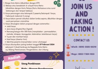 Metro – Pemkot Metro kembali gelar lomba teknologi dan inovasi terapan yang dapat diikuti oleh para siswa dan juga mahasiswa Kota Metro. Lomba teknologi dan inovasi terapan tersebut dapat diikuti secara berkelompok yang tiap kelompok beranggotakan 4 orang dengan identitas warga Kota Metro dan berstatus pelajar atau mahasiswa aktif. Tiap kelompok yang ingin ikut serta dalam perlombaan tersebut diharuskan menciptakan 1 karya orisinil kerja kelompok yang belum pernah atau ada yang serupa pada perlombaan sejenis dengan syarat adanya surat pernyataan orisinalitas yang dapat Menyatakan bahwa karya beserta laporan Tugas Akhir ini adalah benar, merupakan hasil karya sendiri dan bukan duplikasi dari hasil karya orang lain. Kemudian para peserta dapat mendaftar dengan cara menuangkan karya dalam bentuk proposal yang berisikan judul karya, jenis karya (digital/non digital), rancang bangun minimum 300 Kata (menjelaskan: permasalahan, metode, tahapan, keunggulan, kelemahan, keterbaruan karya), dengan tujuan dan manfaat beserta hasil dan foto karya, dan juga identitas peserta disertai nomor yang dapat dihubungi. Karya dikumpulkan paling lambat tanggal 07 Februari 2024 sebanyak 2 hardcopy ke Kantor Bappeda Kota Metro cq. Bidang Perencanaan, Pengendalian, dan Litbang. Bagi kelompok yang karya teknologi dan inovasinya terpilih akan mendapatkan piala dan piagam penghargaan dari Walikota Metro serta uang pembinaan serta akan diikutsertakan pada lomba tingkat Provinsi dan Nasional. Bagi yang ingin mendaftar dapat menghubungiWiwik: 0895-3585-66241 & Maya: 0852-7364-4551