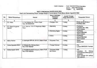 Berdasarkan Job Canvassing pada bulan Agustus 2023 dari Dinas Tenaga Kerja dan Transmigrasi Kota Metro ke perusahaan-perusahaan di dalam wilayah Kota Metro terdapat 10 perusahaan yang membuka lowongan pekerjaan untuk berbagai jabatan. Hal-hal mengenai informasi mengenai nama dan alamat perusahaan lowongan kerja dan persyaratan lainnya sebagaimana terlampir dalam Informasi Lowongan Pekerjaan Agustus 2023.