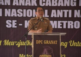 Wali Kota Metro Wahdi memberikan sambutan dan sekaligus melantik Pengurus Dewan Pimpinan Anak Cabang Gerakan Nasional Anti Narkotika (GRANAT) Kota Metro, masa periode 2023-2027. Acara berlangsung di Wisma Haji Al-Khairiyah Kota Metro telah melantik Ketua Harian Granat Metro, Naim Emel Prahana, Selasa (25/07/2023). Dalam hal ini Wali Kota Metro, mengatakan pelantikan Gerakan Nasional Anti Narkotika (GRANAT) merupakan salah satu wujud kepedulian terhadap upaya pemberantasan, penyalahgunaan dan peredaran narkoba di Kota Metro. “Pada kesempatan ini, kami atas nama Pemerintah Kota Metro, mengapresiasi kepada segenap masyarakat Kota Metro yang telah berpartisipasi dengan melakukan langkah-langkah positif, bersama dengan pemerintah dan aparat penegak hukum,” katanya. Menurutnya, dengan pelantikan ini kita telah memiliki suatu wadah resmi yang dapat dimanfaatkan oleh masyarakat untuk menyampaikan berbagai keluhan dan laporan dalam setiap permasalahan yang berkaitan dengan narkotika. “Dengan demikian acara ini diharapkan dapat memutus mata rantai peredaran narkoba di Kota Metro yang kita cintai ini,” ucapnya. Pada kesempatan yang sama, Sekretaris Granat (Gerakan Nasional Anti Narkotika) Provinsi Lampung Agus BN, memaparkan salah satu kegiatan pokok yaitu mensosialisasikan kepada masyarakat tentang bahaya penyalahgunaan dan peredaran gelap narkoba. Serta melakukan sweeping bersama dengan aparat yang berwajib di tempat-tempat yang disinyalir sebagai tempat transaksi narkotika. “Menyadari pentingnya upaya Preventif dan Edukatif (Mencegah lebih baik dari pada mengobati) dalam pemberantasan penyalahgunaan dan peredaran gelap narkoba. Maka itu kami harapkan Gerakan Nasional Anti Narkoba dan Badan Narkotika Nasional Kota Metro, dapat dijadikan sebagai barometer dan wadah Yuridis Formal untuk semakin meningkatkan kepedulian guna memberantas jaringan terselubung Narkoba di Kota Metro,” pungkasnya. (Gt/Sr)