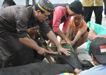 Walikota Metro beserta Wakil Walikota Metro, memotong dan menyaksikan penyembelihan hewan Qurban pada Idul Adha 1444 H/2023 M, bertempat di halaman Sekertariat Masjid Agung Taqwa, Jumat (30/06/2023). Dalam kesempatan ini Walikota Metro Wahdi, menyampaikan jumlah hewan Qurban yang ada di Kota Metro hampir mencapai 3000 baik berupa sapi dan kambing. “Alhamdulilah dihari yang baik ini saya menyampaikan rasa syukur karena masih dapat bertemu di bulan penuh berkah yaitu Idul Adha. Dimana di bulan inilah Allah SWT memberikan syafa’at nya kepada kita untuk saling berbagi,” kata Wahdi. Tak hanya itu, dengan jumlah hewan qurban di Kota Metro mencapai 3000 an, dan di Masjid Taqwa sendiri ada 9 sapi dan 9 kambing, Wahdi berharap apa yang diberikan pada hari ini, mendapat pahala uang melimpah untuk bekal di akhirat kelak. Sementara itu, Buya Zakaria sebagai tokoh agama memimpin doa dan menyampaikan apa yang telah di Qurbankan oleh masyarakat untuk sesama kaumnya, dapet menjadi bekal kelak di akhirat. “Proses penyembelihan merupakan watak karakter kehewanan, sehingga kita menjadi manusia yang utuh. Semoga dari niat berqurban ini dapat menjadi pahala yang terpisah bagi umat yang membutuhkan,* ungkap Buya.