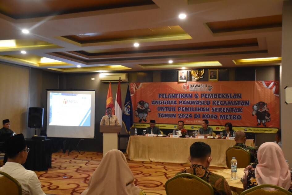 Badan Pengawas Pemilu (Bawaslu) Kota Metro, melantik 15 calon anggota terpilih Pengawas Pemilu Kecamatan (Panwascam) se-Kota Metro untuk pemilihan serentak 2024, di Hotel Aidia Grande setempat, Kota Metro, pada Ju’mat (24-05-2024).