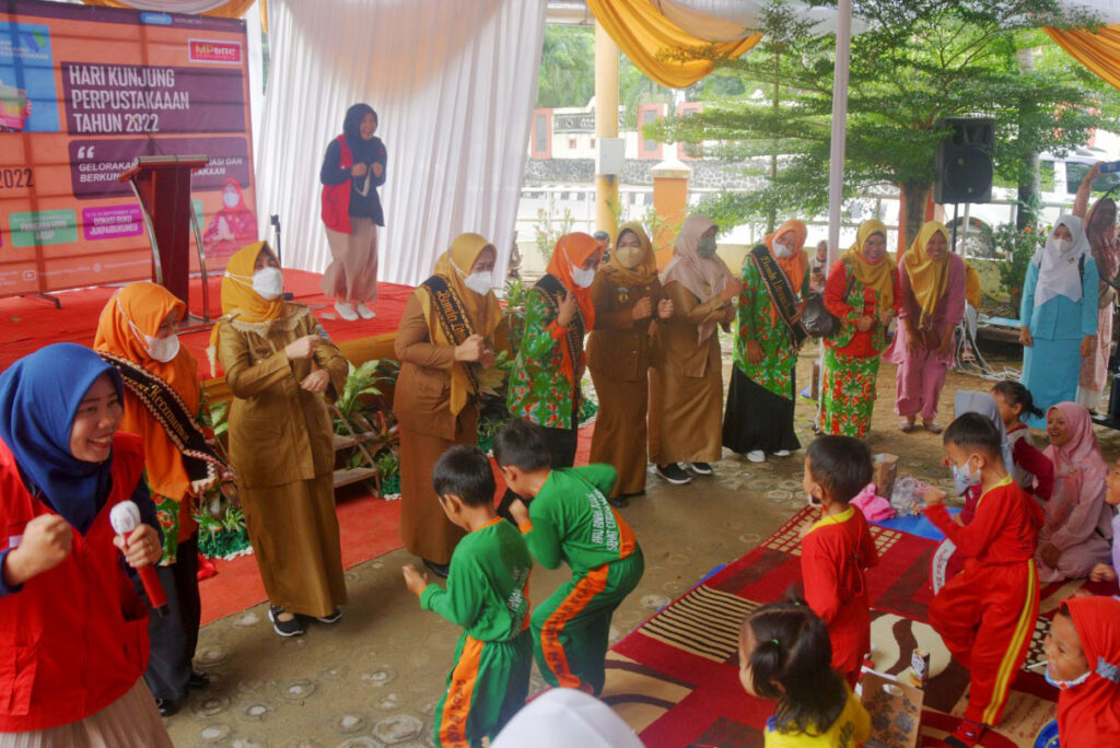 Peringatan Hari Kunjung Perpustakaan Tahun 2022 berlangsung meriah, salah satunya dihadiri Bunda Literasi Kota Metro Silfia Naharani, di Halaman Dinas Perputakaan dan Kearsipan Daerah Kota Metro, Senin (12/09/2022).
