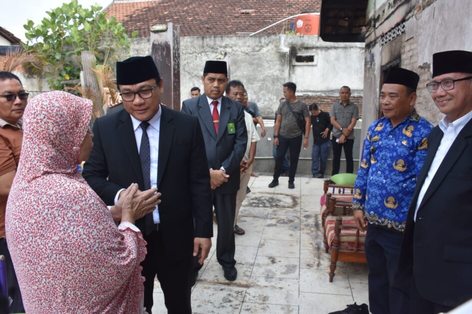 Walikota Metro dr. Wahdi Siradjuddin, Sp.OG (k), M.H didampingi Forkopimda Kota Metro memberikan santunan kepada korban bencana kebakaran, di rumah milik Ibu Madris Niat, alamat Gang Tanjung RT.27 A Rw. 06 Kelurahan Hadimulyo Barat, Kecamatan Metro Pusat Kota Metro, Minggu (01/10/2023).