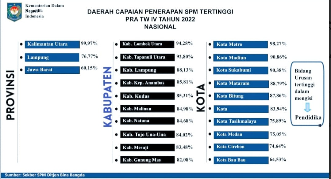 Berdasarkan data Kementerian Dalam Negeri Republik Indonesia (Kemendagri), Kota Metro berhasil meraih predikat terbaik atas Standar Pelayanan Minimal (SPM) kategori kota se-Indonesia triwulan ke-4 Tahun 2022 di bidang urusan tertinggi dalam pengisian pendidikan.