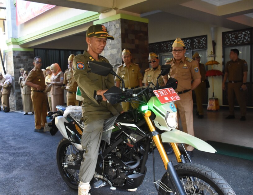 Walikota Metro, dr. Wahdi Siradjuddin, Sp.OG(K), M.H menyerahkan satu unit kendaraan dinas (randis) roda dua jenis trail beserta kelengkapan patroli, kepada Kepala Satuan Satpol PP Kota Metro, Jose Sarmento bersamaan saat pelaksanaan Apel Mingguan Pemerintah Kota Metro, senin 4 September 2023 di halaman Kantor Walikota Metro.