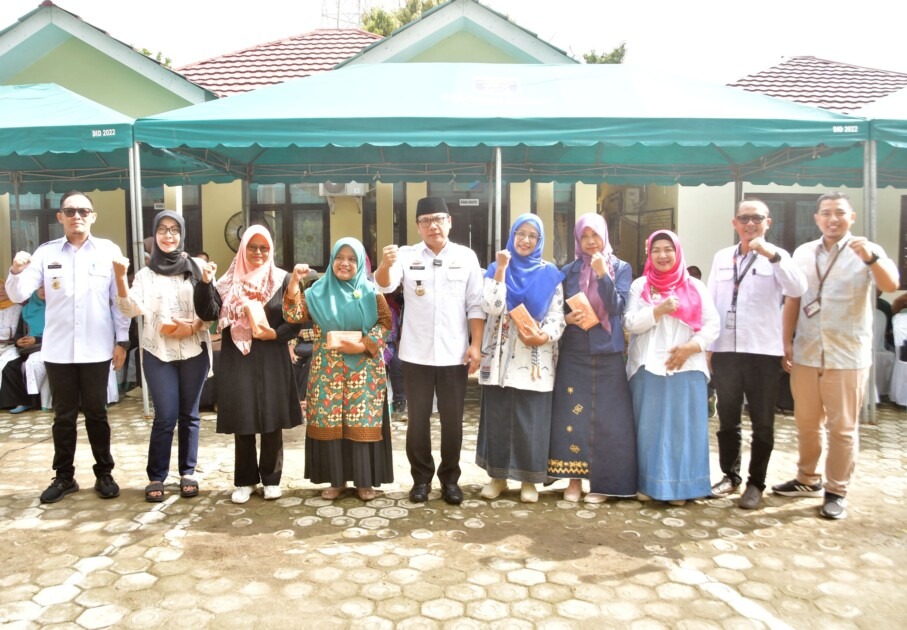 Wali Kota Metro Wahdi menyerahkan bantuan secara simbolis berupa benang emas tapis kepada beberapa pelaku UMKM yang hadir di kegiatan Halal Bihalal dan Coffee Morning di Dinas Koperasi UMKM dan Perindustrian Kota Metro, pada Kamis (18/04/2024).