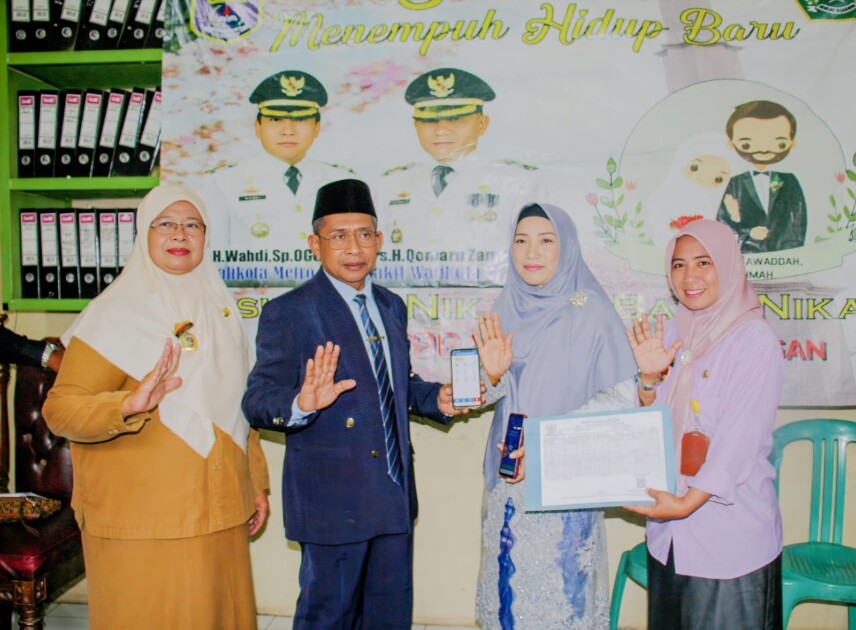 Dalam mewujudkan Program Walikota dan Wakil Walikota Metro, Staf Ahli Walikota Bidang III Juni Kuswati, menghadiri acara akad nikah Fasilitasi Pernikahan di Kantor Urusan Agama (KUA) Metro Timur, Selasa (02/05/2023).