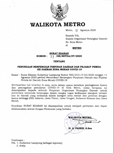 Berdasarkan hal tersebut, serta dalam upaya menekan peningkatan kasus dan pencegahan penularan Covid-19 di Kota Metro, maka kepada seluruh Pimpinan Organisasi Perangkat Daerah (OPD) untuk menunda bepergian. Baik berpergian dalam rangka tugas kedinasan, maupun urusan lain ke daerah dalam kategori zona merah.