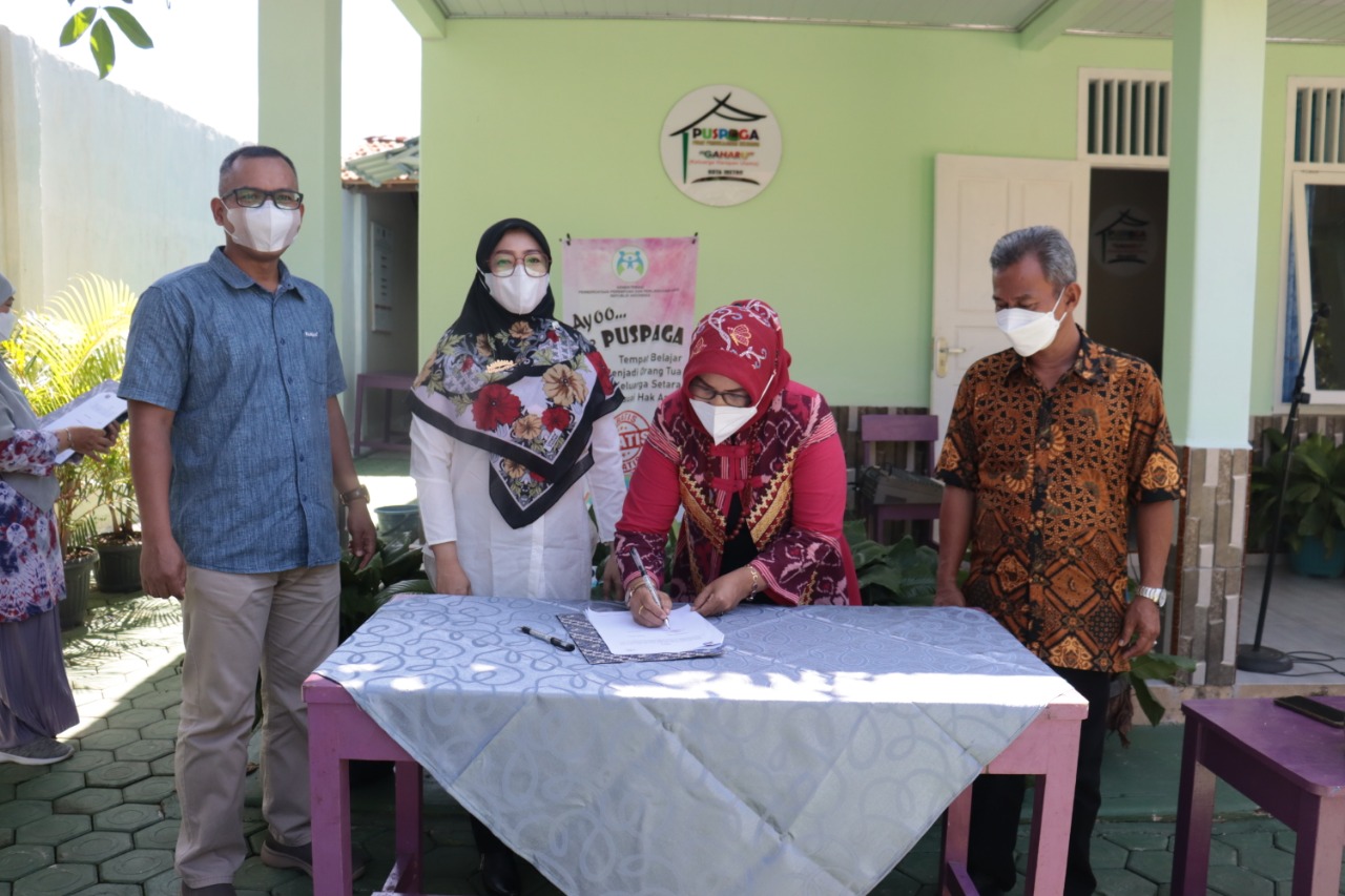 Penandatanganan Nota Kesepakatan (MoU) Puspaga Gaharu dengan camat dan lurah se-Kota Metro berlangsung di Halaman SLB Insan Madani Metro, Sabtu (12/03/2022).