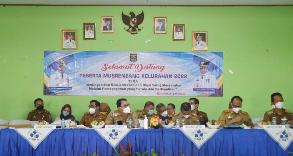 Musyawarah Perencanaan Pembangunan (Musrenbang) kelurahan berlangsung di Aula Kelurahan Yosodadi, Metro Timur. Musrenbang tahun ini bertemakan “Meningkatkan Kesejahteraan Dan Daya Saing Masyarakat Melalui Pembangunan Yang Merata Dan Berkeadilan”, Selasa (8/2/2022).