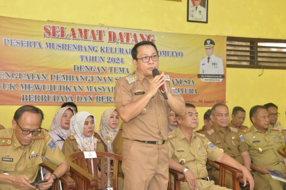 Walikota Metro, Dr. Wahdi Siradjuddin, Sp.OG(k), M.H, beserta jajaran di Lingkungan Pemerintah Kota Metro kembali menggelar musyawarah perencanaan dan pembangunan (musrenbang) perdana tingkat Kelurahan tahun 2024 yang berlangsung di Aula Kelurahan Rejomulyo, Selasa (30/01/2024).