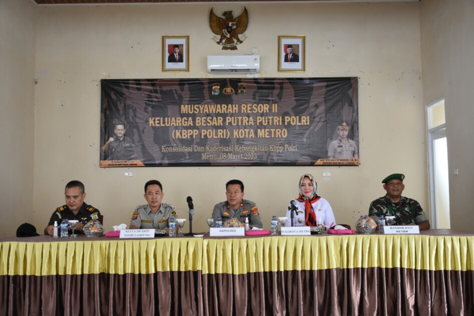 Kepala Kesbangpol (Kesatuan Bangsa dan Politik) Kota Metro Rosita, mewakili Walikota Metro menghadiri acara Musyawarah Resort 2 Keluarga Besar Putra Putri Polri (KBPP Polri) Kota Metro, yang berlangsung di Aula Sanika Satyawada Mapolres Metro, Rabu 08/03/2023.