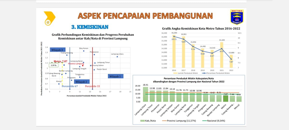 Selain itu capaian terendah ini juga patut diapresiasi, karena berada pada posisi di bawah presentase penduduk miskin nasional yaitu 9,54% maupun provinsi yaitu 11,57%. Presentase penduduk miskin Kota Metro tahun 2022 terendah ketiga se Provinsi Lampung. Dimana terendah pertama ditempati Kabupaten Mesuji dengan nilai 6,84%, terendah kedua disusul Tulang Bawang Barat 7,44% dan Kota Metro 7,87%. Demikian pula penduduk miskin ekstrem Kota Metro tahun 2022 menduduki peringkat terendah kedua sebesar 0,83% setelah Kabupaten Mesuji sebesar 0,38% dari jumlah penduduk.