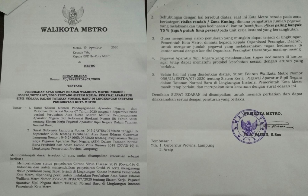 Memperhatikan status penyebaran Corona Virus Disease 2019 (Covid-19) di Indonesia dan untuk mengendalikan penyebaran Covid-19 serta mengurangi risiko penularan yang dapat terjadi di Lingkungan Kantor Instansi Pemerintah Kota Metro, maka Pemkot Metro mengatur banyaknya jumlah pegawai  yang melaksanakan tugas kedinasan di kantor paling banyak 75% pada unit kerja instansi yang bersangkutan.