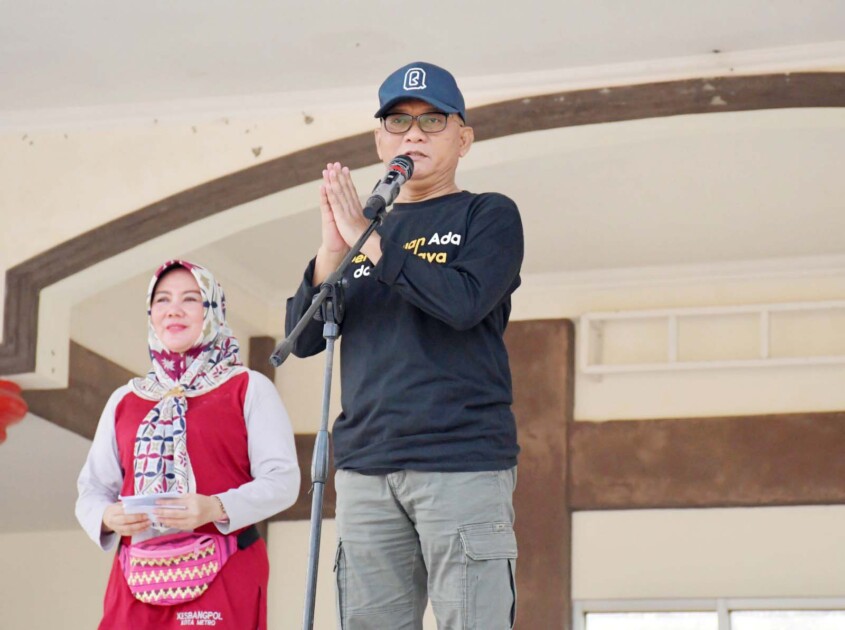 Wakil Walikota Metro, Qomaru Zaman, memberikan sambutan pada pelaksanaan senam bersama anti narkoba dan Lauching Startegi Kolaborasi Penanggulangan Penyalahgunaan (SIGULA) Nakorba di Kota Metro, yang berlangsung Lapangan Samber Kota Metro, Jumat (26/05/2023).