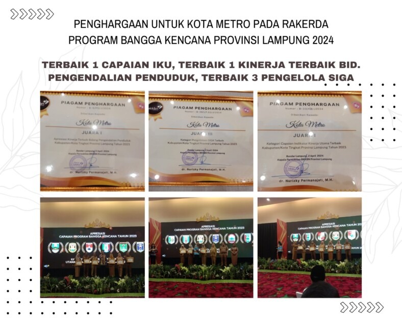 Pemerintah Kota Metro melalui Dinas Pemberdayaan Perempuan Perlindungan Anak dan Pengendalian Penduduk Kota Metro (PPA-PPKB) Kota Metro berhasil memborong tiga penghargaan dari Dinas BKKBN Provinsi Lampung.
