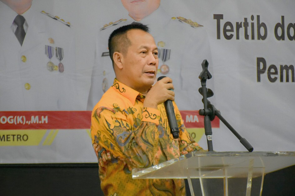 Staf Ahli III Wali Kota Metro membuka kegiatan Sosialisasi dan Orientasi Pemilu Aman , Tertib dan Damai di Kota Metro, yang berlangsung di Hotel Grand Skuntum Kota Metro, Selasa (14/11/2023).