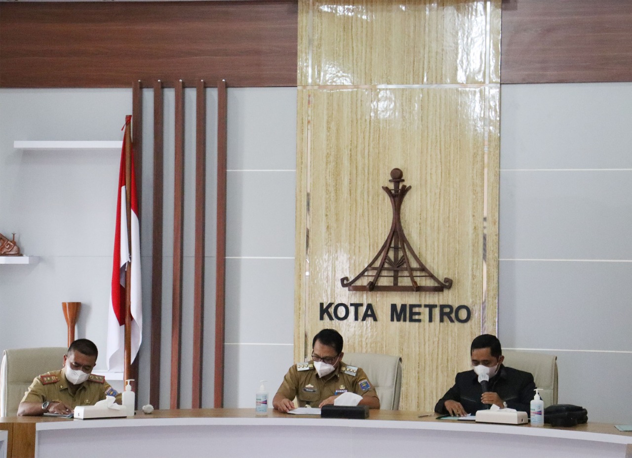 Pemerintah Kota Metro melakukan evaluasi terkait dalam Pemberlakuan Pembatasan Kegiatan Masyarakat (PPKM) Level I, berlangsung di Guest House Rumah Dinas Walikota, Selasa (12/04/2022).