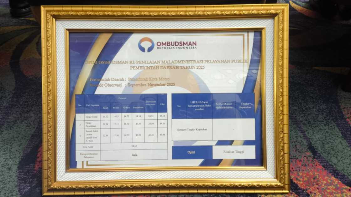 Capaian tersebut ditandai dengan penerima penghargaan terkait Penilaian Maladministrasi Pelayanan Publik Tahun 2025, pada periode observasi September- November 2025. Penghargaan diterima oleh Walikota Metro yang terwakili oleh Wakil Walikota Metro Rafieq Adi Pradana di Gedung Balai Keratun Lantai III, Komplek Kantor Gubernur Lampung, pada Senin (9/2/2026).