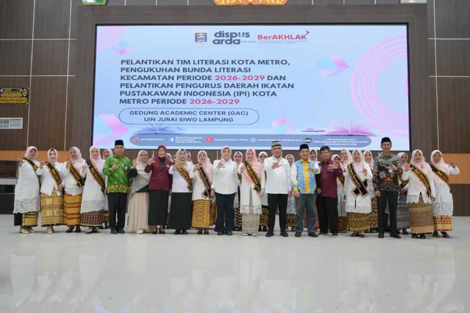 Pemerintah Kota Metro menggelar Pelantikan Tim Literasi Kota Metro, Pengukuhan Bunda Literasi Kecamatan dan Kelurahan, serta Pelantikan Pengurus Daerah Ikatan Pustakawan Indonesia (IPI) Kota Metro Tahun 2026 di Ruang Auditorium UIN Jurai Siwo Lampung, Rabu (25/02/2026).