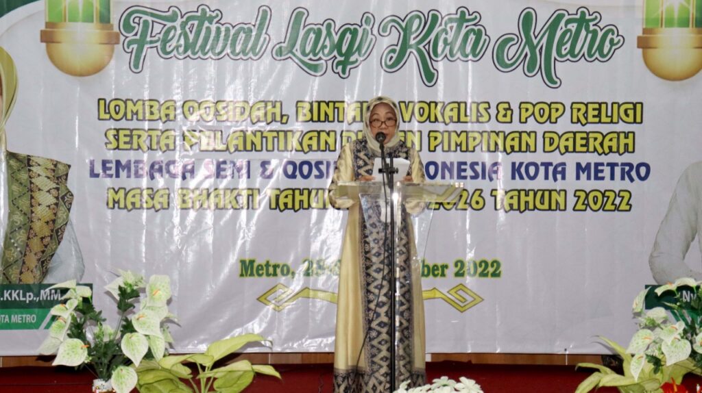 Ketua DPW Lembaga Seni dan Qasidah Indonesia (LASQI) Provinsi Lampung, Ria Andari selaku Ketua Harian melantik dan mengukuhkan pengurus DPD LASQI Kota Metro Masa Bhakti 2021 – 2026, di Ballroom Grand S’kuntum Rabu, 30/11/2022.