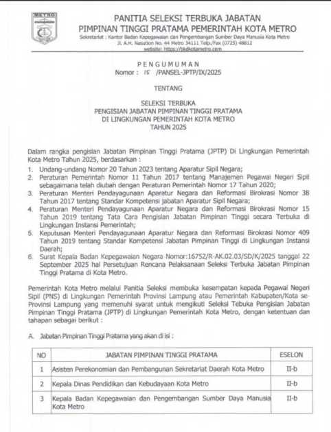 6. Surat Kepala Badan Kepegawaian Negara Nomor:16752/R-AK.02.03/SD/K/2025 tanggal 22 September 2025 hal Persetujuan Rencana Pelaksanaan Seleksi Terbuka Jabatan Pimpinan Tinggi Pratama di Kota Metro.