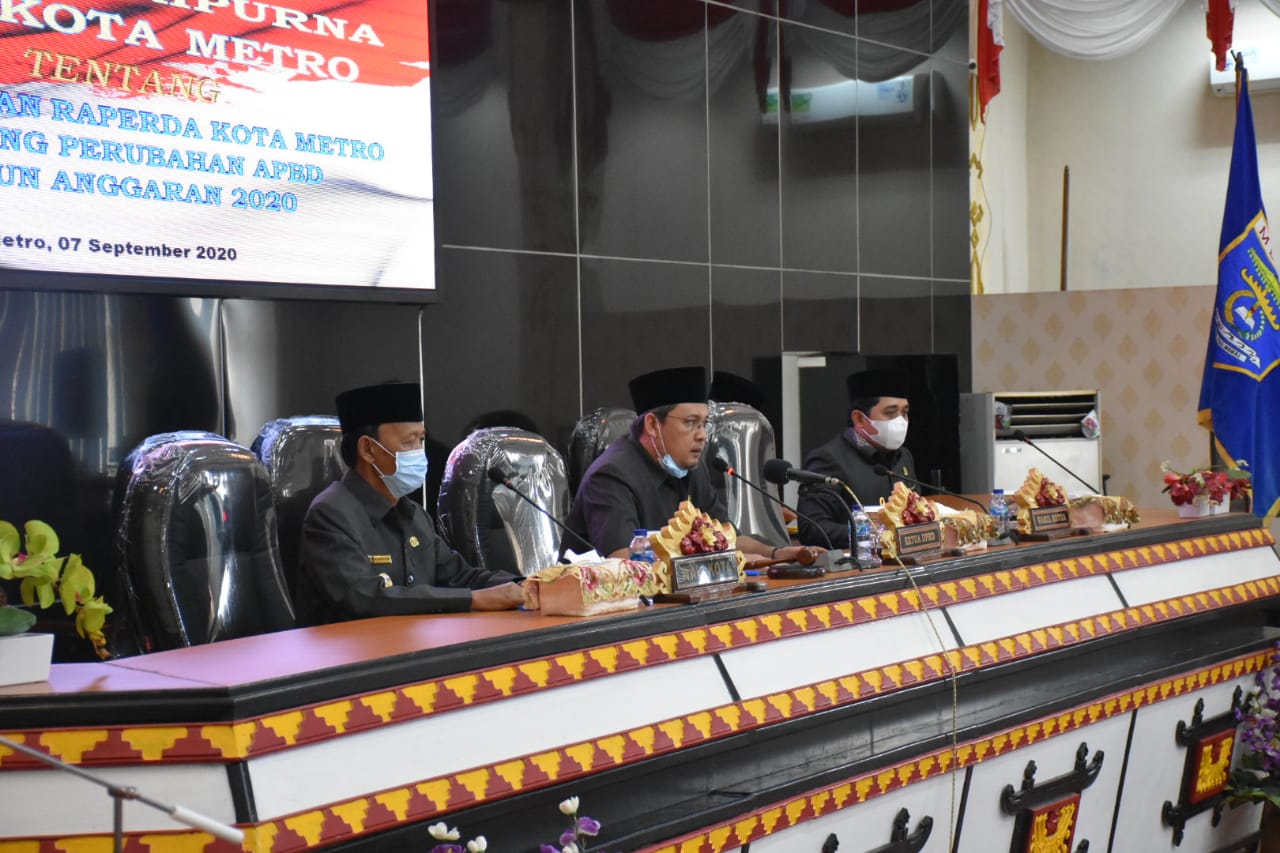 Walikota Metro menyampaikan nota keuangan atas Rancangan Peraturan Daerah Kota Metro tentang APBD Perubahan tahun anggaran 2020 di Ruang Sidang DPRD setempat, Senin (07/09/2020). Rapat Paripurna yang berlangsung tersebut dipimpin langsung oleh Ketua DPRD Kota Metro Tondi Muammar Gaddafi Nasution.