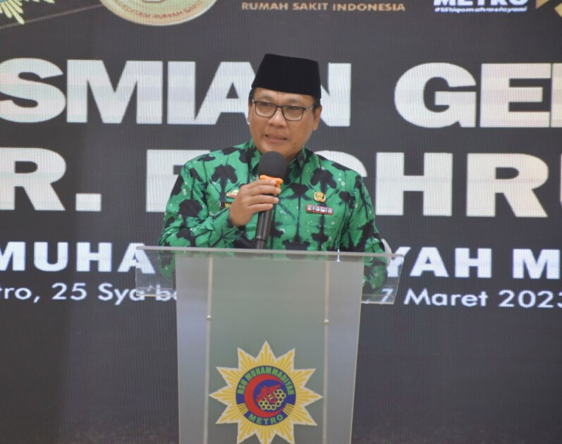 Walikota Metro Wahdi Siradjuddin, memberi sambutan dalam peresmian gedung baru K.H. A.R Fachruddin RSU Muhammadiyah Metro, di Jl. Soekarno Hatta No.42, Mulyojati, Metro Barat, Jum’at (17/03/2023).