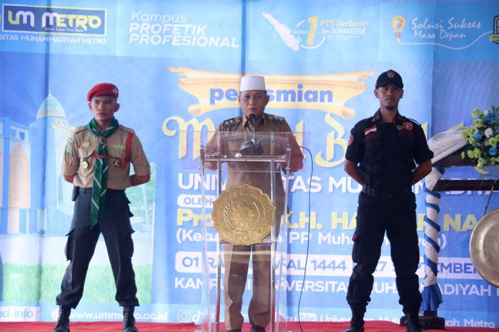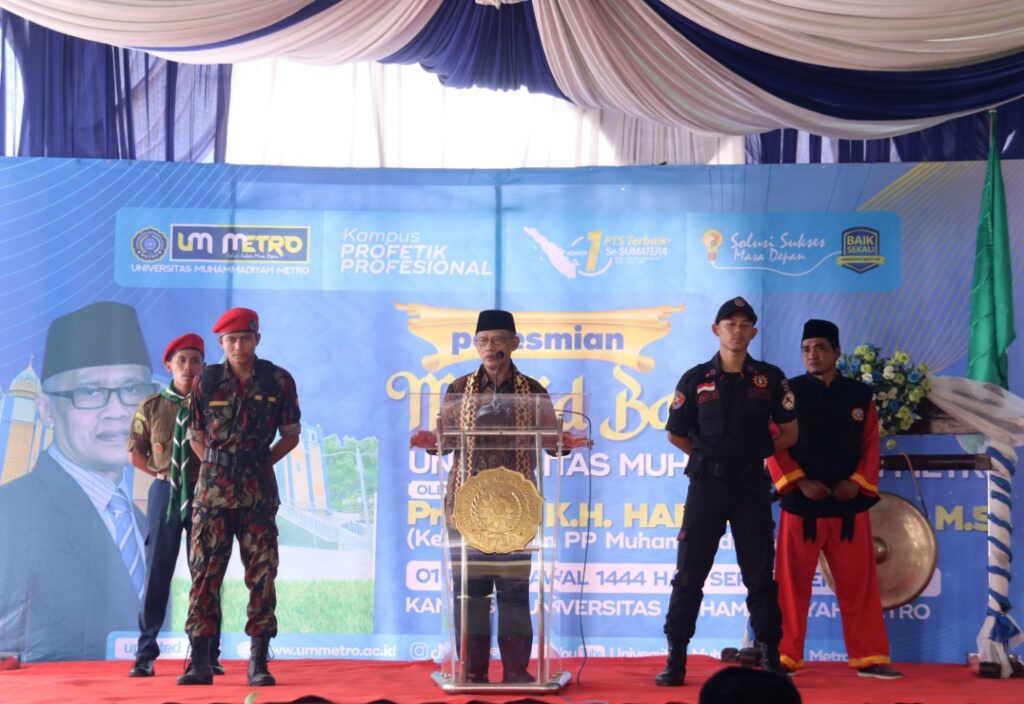 Ketua Umum Pimpinan Pusat Muhammadiyah Prof. Dr. KH Haedar Nashir, M.Si. mengucapkan selamat atas pembangunan Masjid Baitul Hikmah yang berada di Kampus 3 Universiras Muhammadiyah Metro.