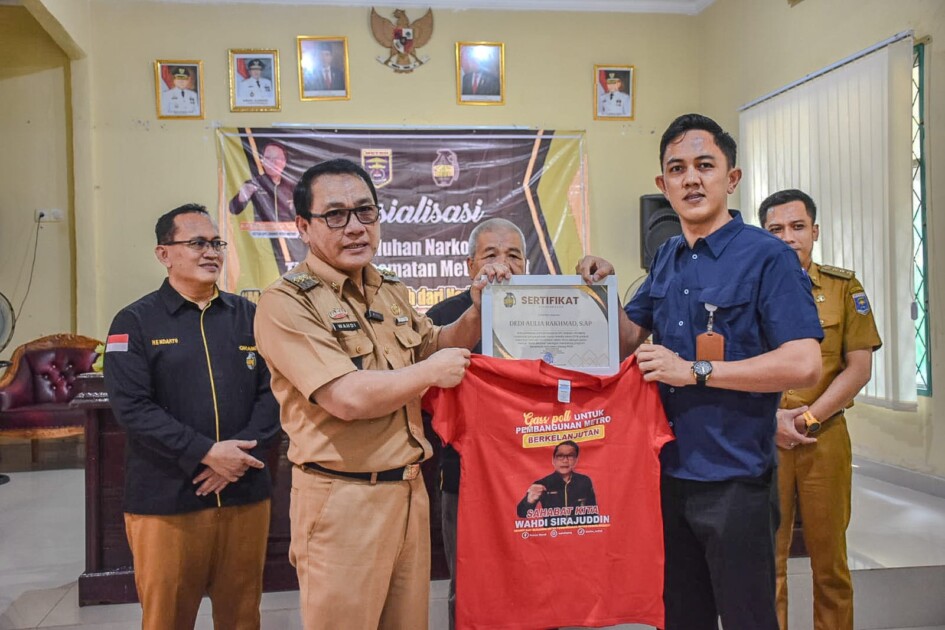 Pada kesempatan tersebut, Wali Kota Metro menyerahkan Baju dan Sertifikasi apresiasi kepada Dedi Aulia Rakhmad, S.AP atas partisipasi aktifnya bersama DPC Granat Kota Metro melakukan pengungkapan kasus narkoba tahun 2024 yang ada di Kelurahan Yosorejo Kecamatan Metro Timur sebagai upaya menuju “Metro Bersinar” sekaligus mendukung program Pemerintah Kota Metro di Bidang P4GN. (Yl/Ti)
