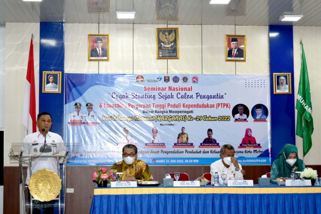 Wakil Walikota Metro Qomaru Zaman didampingi Asisten l Bidang Pemerintahan dan Kesra buka Seminar Nasional dengan tema cegah stunting sejak calon pengantin serta peresmian perguruan tinggi peduli kependudukan (PTPK), di Gedung HI Lt. 2 Universitas Muhammadiyah Metro, Kamis (23/06/2022).
