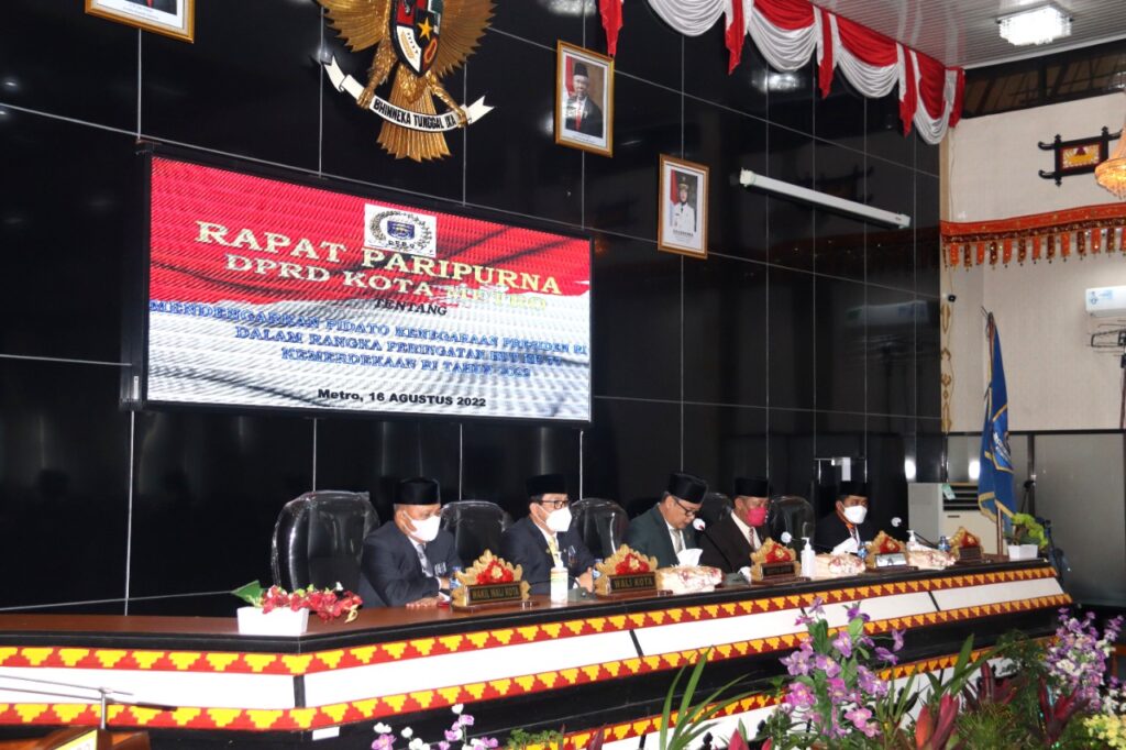 Dewan Perwakilan Rakat Daera (DPRD) Kota Metro menggelar rapat Paripurna dalam rangka HUT ke-77 Republik Indonesia (RI), dengan agenda mendengarkan pidato Kenegaraan Presiden RI Tahun 2022. Acara berlangsung di Ruang Sidang Paripurna DPRD Kota Metro, Senin (16/08/2022).