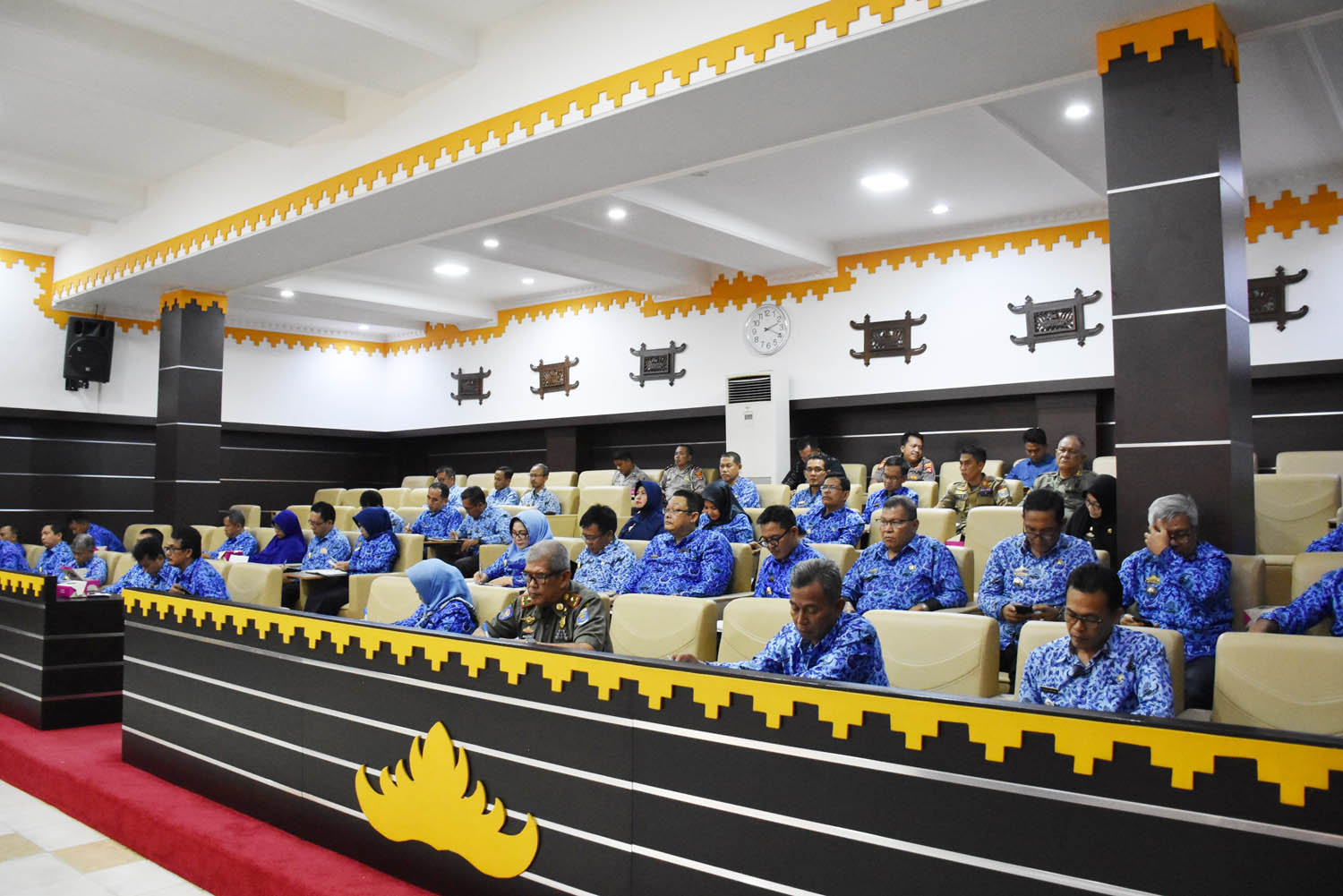 Sekda beserta Kepala OPD lakukan Rapat penindaklanjutan Work From Home dan Kegiatan Sosialisasi Covid 19, berlangsung di Aula Pemda Kota Metro, Selasa (17/03/19).