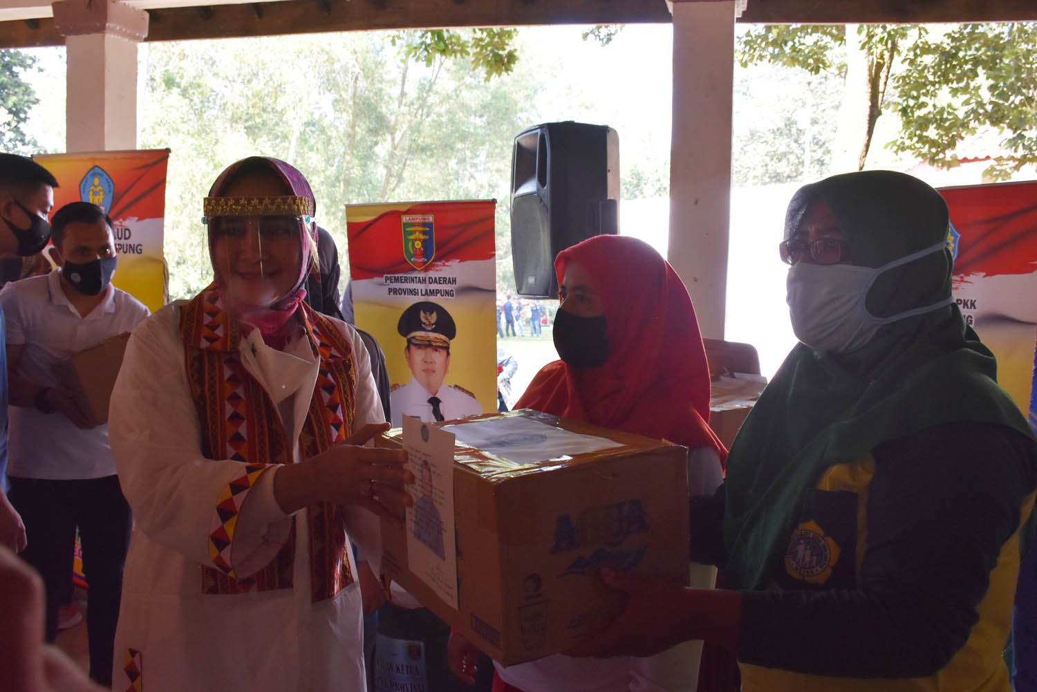 Kunjungan Ketua Purwosi Provinsi Lampung Riana Sari Arinal ke Wisata Alas Puri sebagai bentuk penyerahan bantuan 100 paket sembako dari Yayasan Bunda Suci.