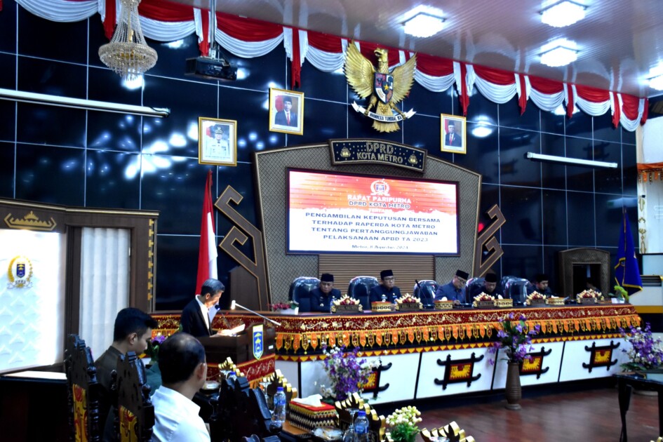 Walikota Metro menyampaikan berapa hal dalam Rapat Paripurna Dewan Perwakilan Rakyat Daerah (DPRD) Tentang Pengambilan Keputusan Bersama terhadap Raperda Kota Metro tentang Pertanggungjawaban Pelaksanaan Anggaran Pendapatan dan Belanja Daerah (APBD) Tahun 2023.