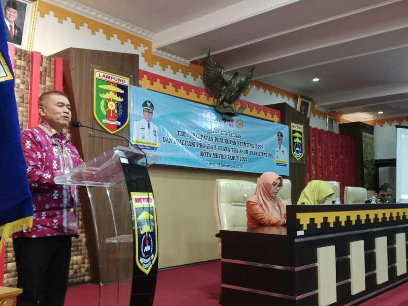 Sekda Kota Metro Ir. Bangkit Haryo Utomo memberikan sambutan sekaligus membuka Rapat Koordinasi Tim Percepatan Penurunan Stunting (TPPS) tingkat Kota Metro, di Aula Pemerintah Kota Metro pada hari Kamis 5/12/2024.