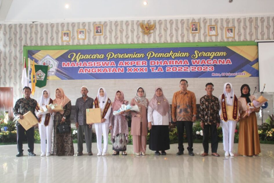 Pemerintah Kota Metro melalui Staff Ahli Walikota Bidang III meresmikan Penggunaan Pakaian Seragam (Capping Day) Mahasiswa Akademi Perawat Dharma Wacana Metro yang berlangsung di Gedung Wisma Haji, Kamis (09/02/2023).