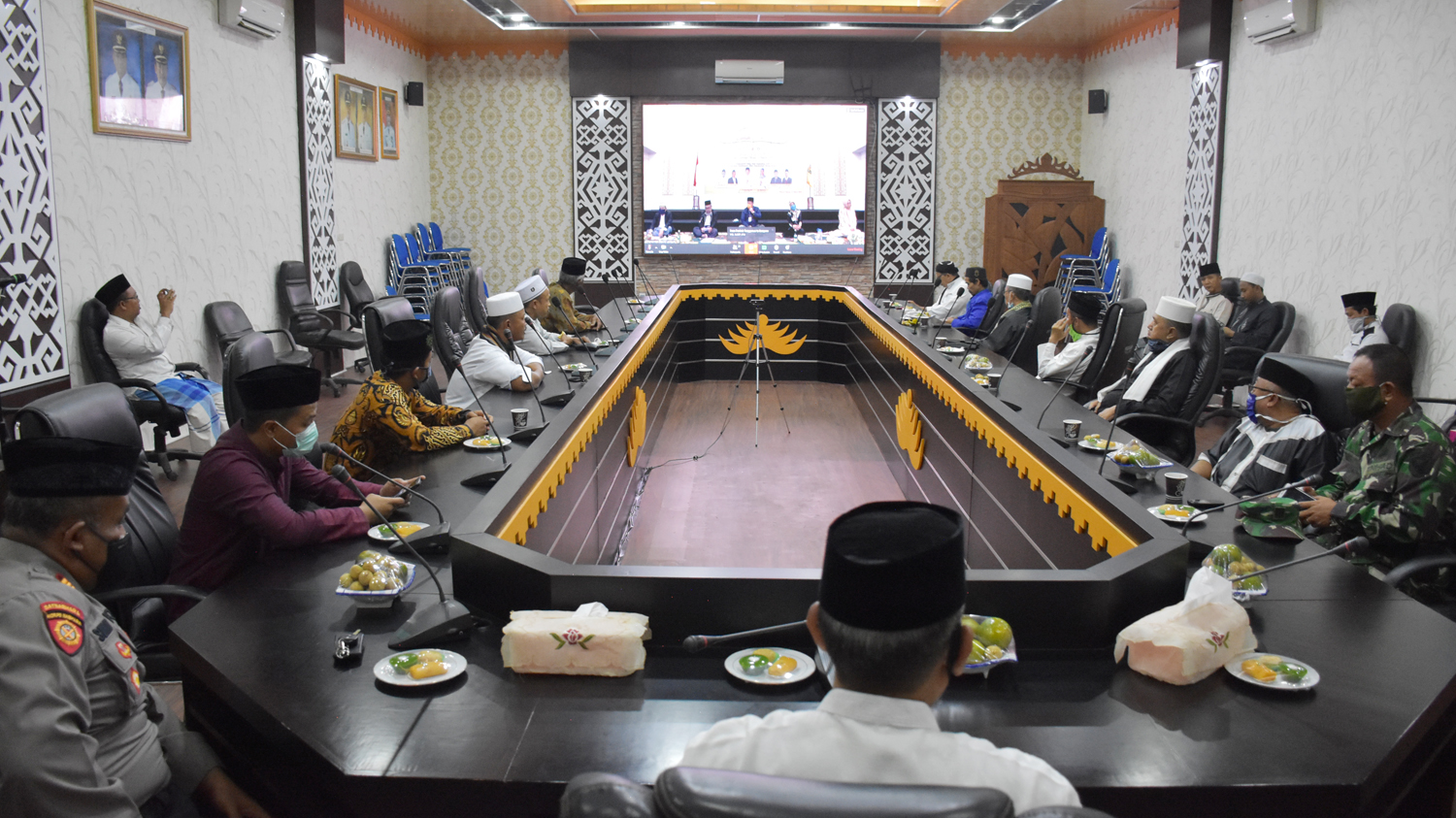 Gubernur Lampung Arinal Djunaidi melakukan teleconference dalam rangka zikir dan doa bersama dengan pejabat se-Provinsi Lampung, dalam menyambut Bulan Suci Ramadan di Operation Room (OR) dan Ruang Sekda Metro, Rabu Malam (22/04/2020).