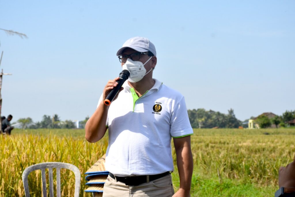 Walikota Metro menghadiri syukuran panen padi Kampung Peng-angguran, dengan ikut melakukan panen padi secara simbolis. Panen padi tersebut berlangsung di sawah Kampung Peng-angguran Kelurahan Yosodadi, Metro Timur, Minggu 20/3/2022.