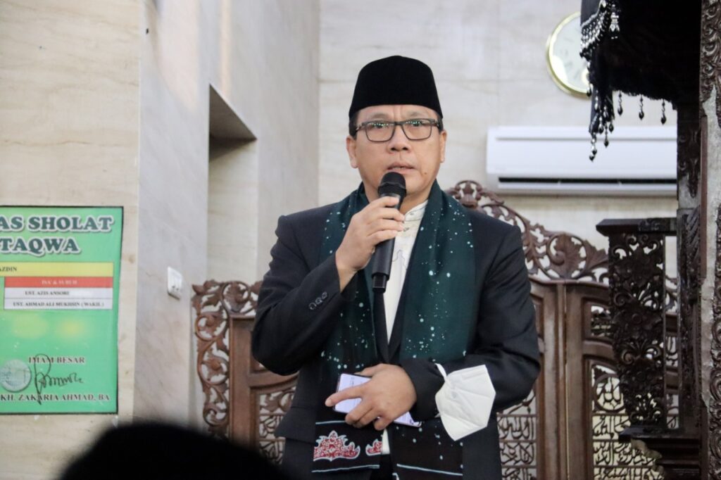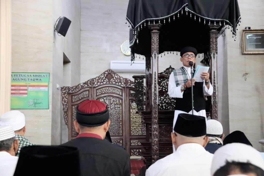 Walikota Metro Wahdi mengucapkan puji syukur kepada Allah SWT dengan segala limpahan hidayatnya, sehingga kita dapat melaksanakan salat Idul Adha 1443 H di Masjid Taqwa Kota Metro.