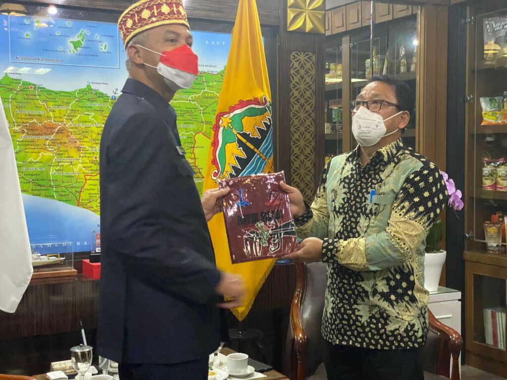 Pada kesempatan yang sama, Wahdi memberikan peci kopiah dan batik produk lokal yang langsung dikenakan Ganjar. Sementara Ganjar memberikan buku biografi berjudul Jembatan Perubahan.