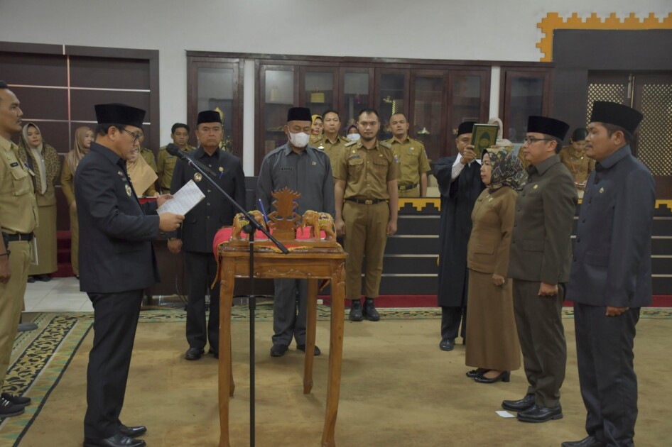 Walikota Metro Wahdi Siradjuddin melantik dan mengangkat sumpah jabatan struktural pada Jabatan Pimpinan Tinggi Pratama (JPTP) di lingkungan Pemerintah Kota Metro, di Aula Pemda Kota Metro, Senin (27/03/2023).