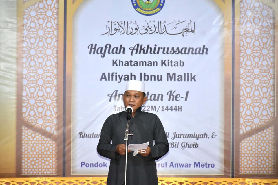 “Terima kasih Wakil Walikota Metro Qomaru Zaman, yang telah menyempatkan waktunya untuk hadir pada acara Haflah Akhirussunnah dan Wisuda Khataman Kitab Alfiyah Ibnu Malik, yang dimana saat ini merupakan pertama kalinya Ponpes Nurul Anwar melaksanakan kegiatan setelah berusia 2,5 tahun berdiri lamanya,” jelasnya.