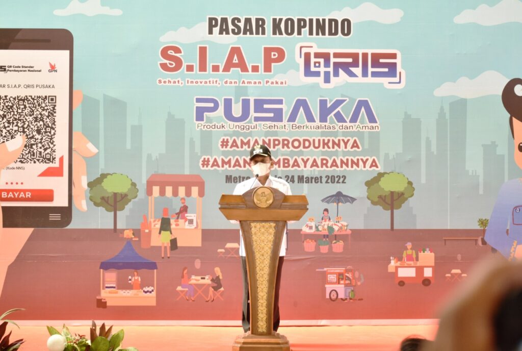 Wakil Walikota Metro Qomaru Zaman, menghadiri sekaligus meresmikan Pasar Sehat, Inovatif, dan Aman Pakai (S.I.A.P) QRIS Produk Unggul, Sehat, Berkualitas dan Aman (PUSAKA). Peresmian ini berlangsung di Pasar Kopindo Metro, Kamis (24/3/2022).