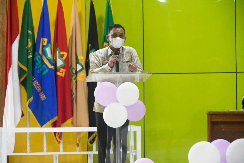 Wakil Walikota Metro menghadiri pengukuhan pengurus Ikatan Keluarga Alumni (IKA) Pendidikan Guru Madrasah Ibtidaiyah (PGMI) dan PGMI Expo, berlangsung di GSG IAIN Kota Metro, Selasa (14/12/2021).