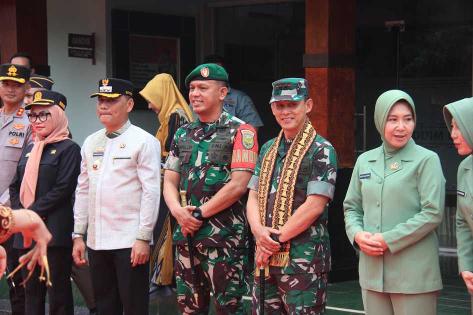 Wali Kota Metro, Bambang Iman Santoso bersama Komandan Kodim (Dandim) 0411/KM Letkol Arh. Rendra Febrandari Suparman menyambut secara langsung kunjungan kerja Panglima Komando Daerah Militer (Pangdam) II/Sriwijaya, Mayjen TNI Ujang Darwis, di Halaman Kodim 014/KM, Kamis (22/05/2025).
