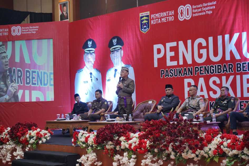 Wali Kota Metro, H. Bambang Iman Santoso, S.Sos., M.Pd.I., didampingi Wakil Wali Kota Metro, Dr. M. Rafiq Adi Pradana, S.H., M.H., bersama jajaran Forum Koordinasi Pimpinan Daerah (Forkopimda), secara resmi mengukuhkan 31 anggota Pasukan Pengibar Bendera Pusaka (Paskibraka) Kota Metro Tahun 2025. Prosesi yang penuh khidmat ini berlangsung di Gedung Sesat Agung Bumi Sai Wawai pada Jumat (15/8/2025).